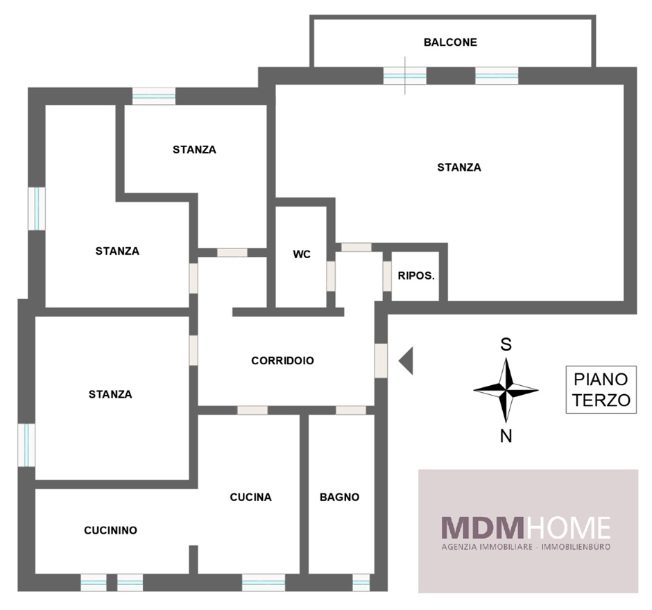 È composto da ingresso, soggiorno doppio con balcone, cucina ampia e abitabile, camera matrimoniale, due camere singole, bagno principale, bagno di servizio e ripostiglio.