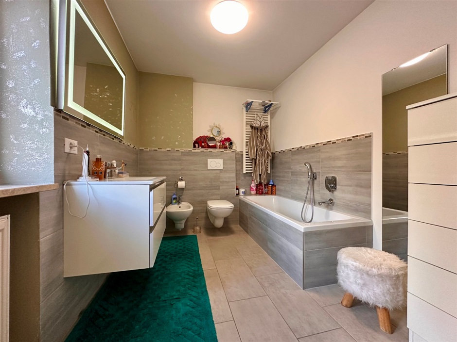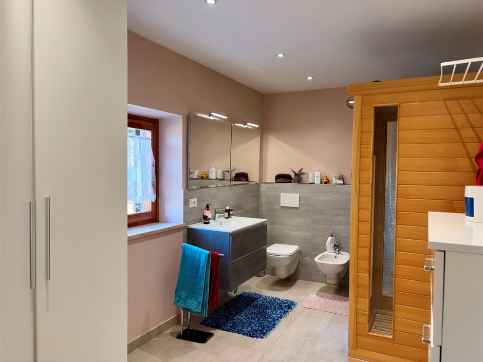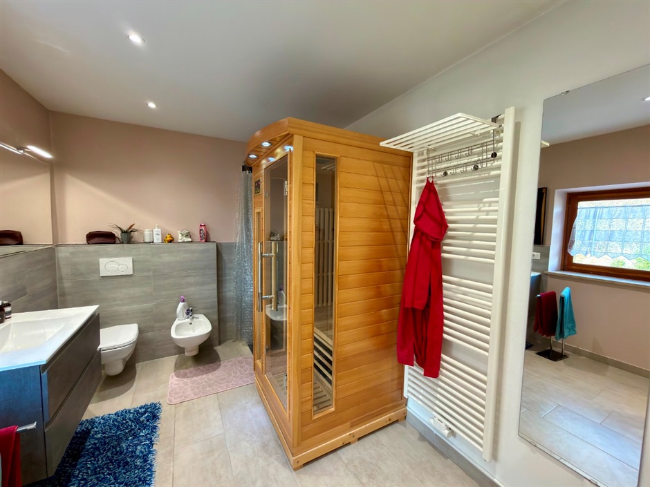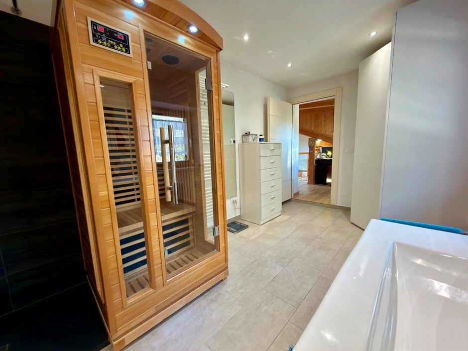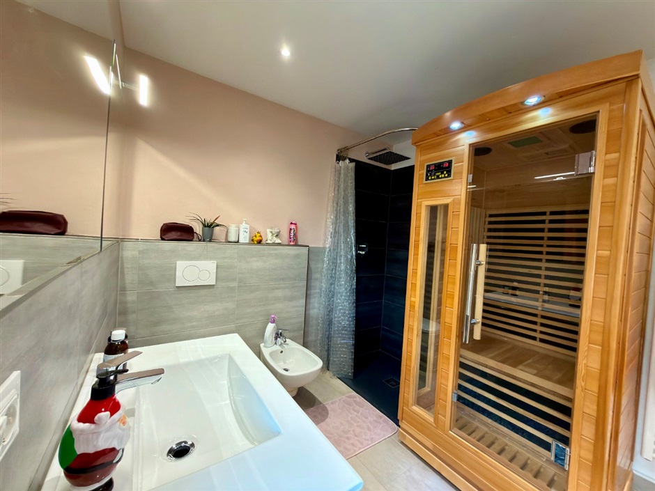 Qui trovi anche un ambiente davvero speciale: un ampio bagno finestrato di 12 mq con doccia, sauna e cromoterapia, arricchito da armadi su misura — un piccolo angolo di benessere quotidiano, tutto per te.