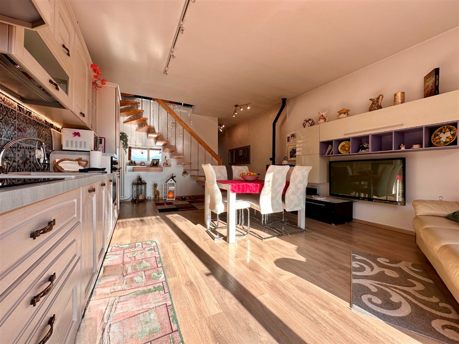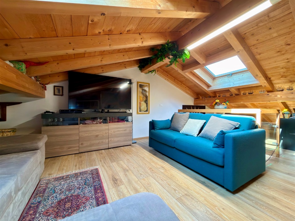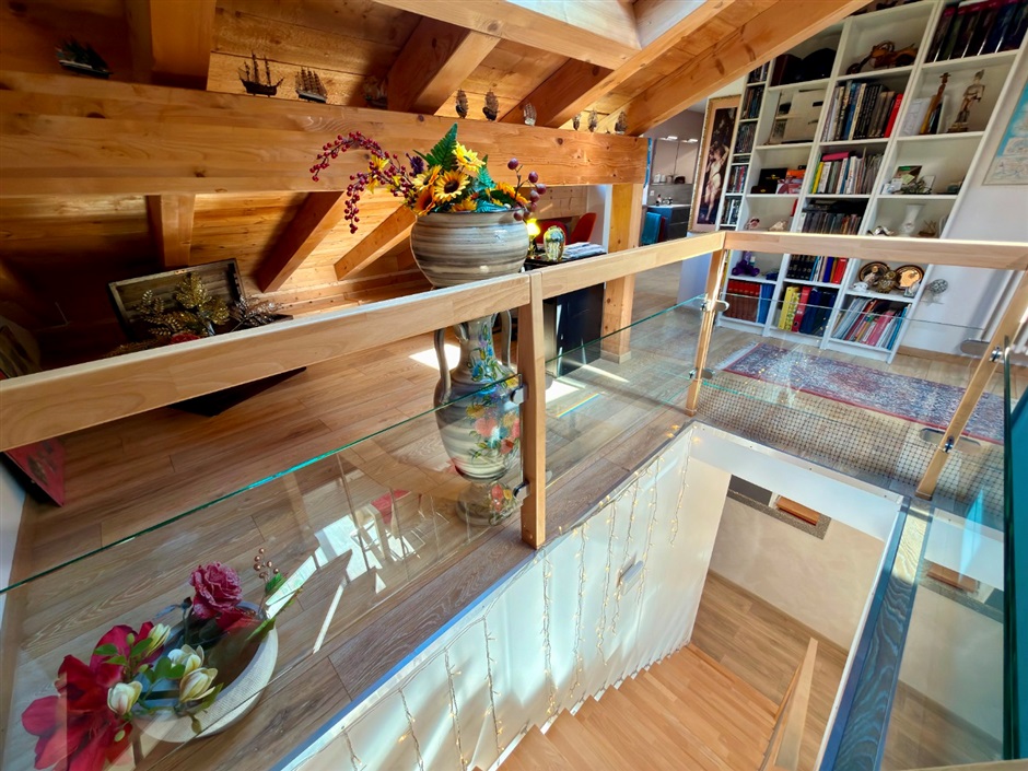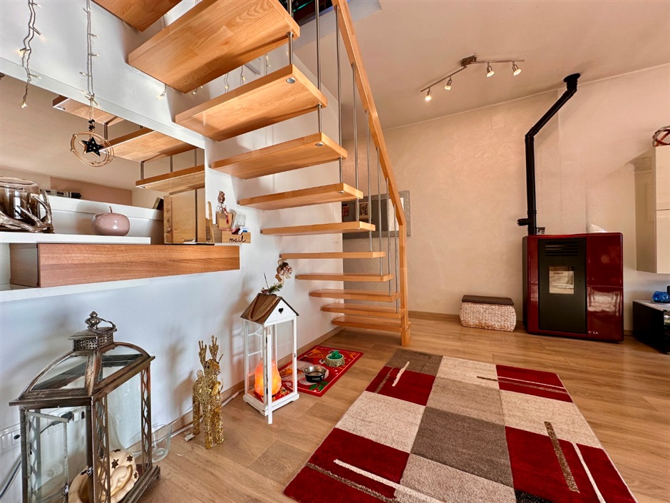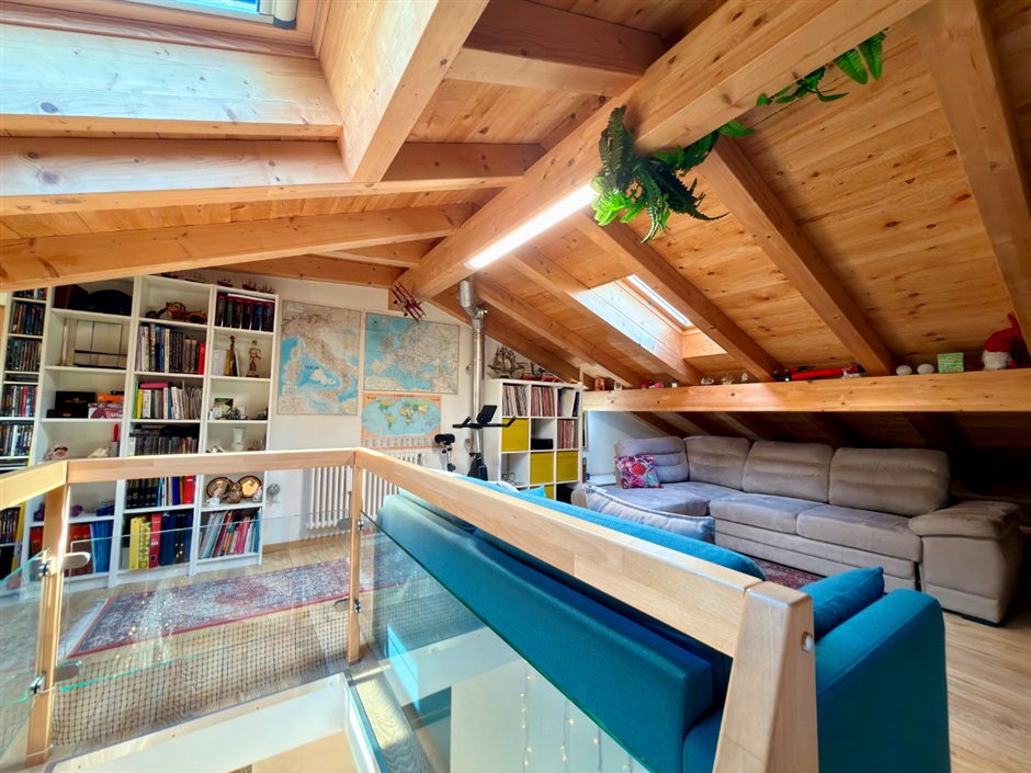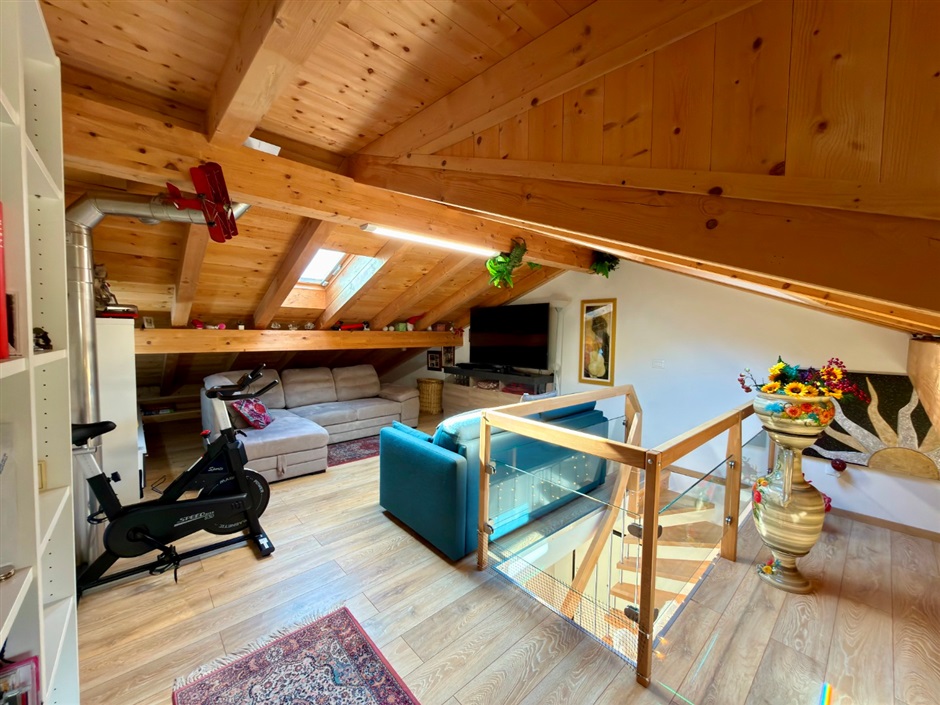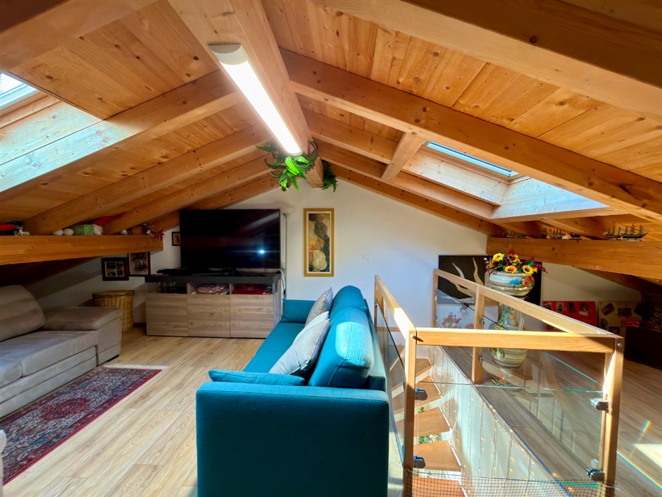 Una raffinata scala in legno conduce al piano superiore, dove l’atmosfera diventa ancora più intima e suggestiva: una stanza mansardata abitabile, avvolta dalla luce naturale che entra da finestre e velux, crea uno spazio perfetto per il relax, il lavoro o i tuoi momenti personali.