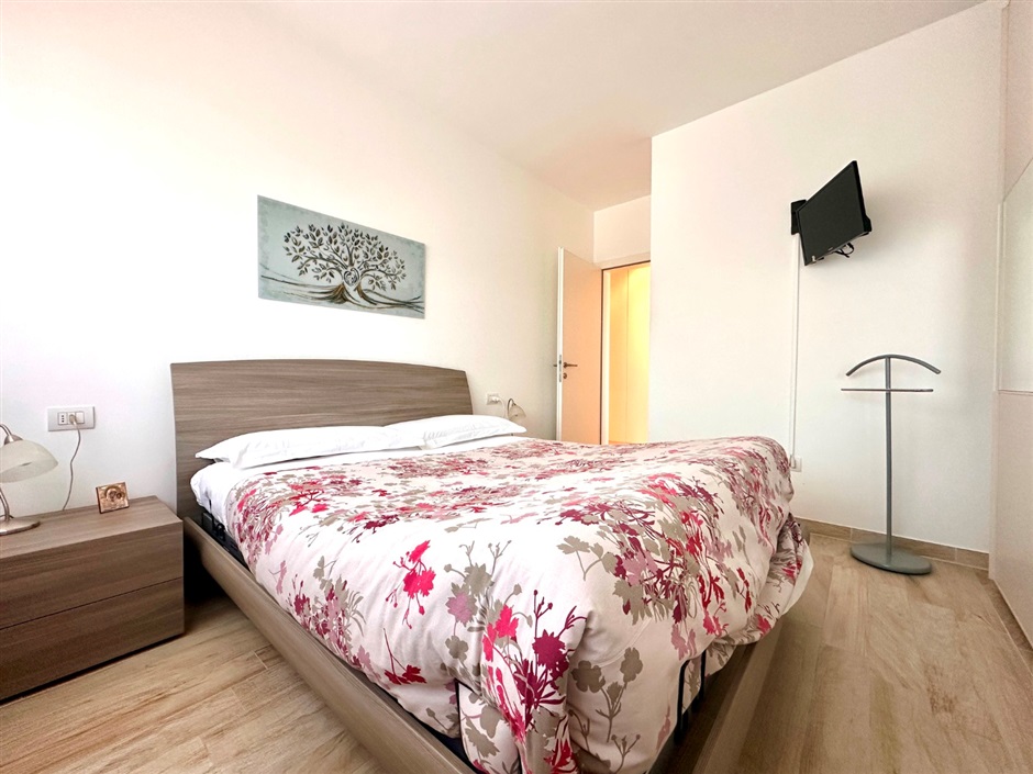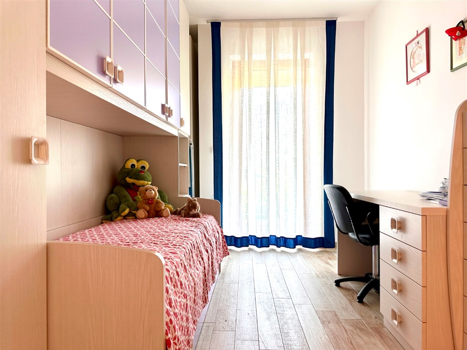 La zona notte è ben organizzata e funzionale, con un pratico armadio lungo il corridoio e due camere da letto. La singola ha un accesso diretto alla splendida terrazza, mentre la camera principale, di quasi 13 mq netti, gode di una grande finestra che regala luce naturale e respiro. Il bagno, finestrato, è completo di doccia e predisposizione per la lavatrice, pensato per essere pratico senza rinunciare al comfort.