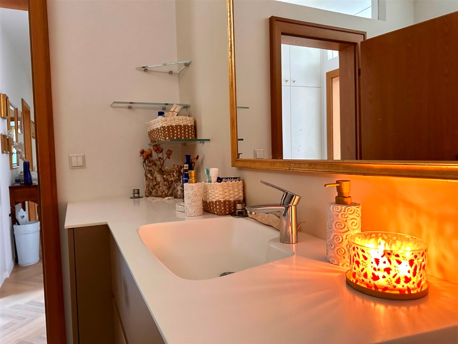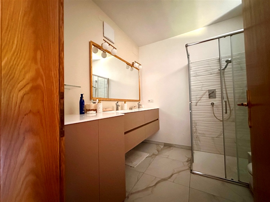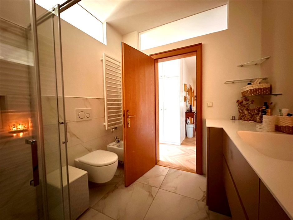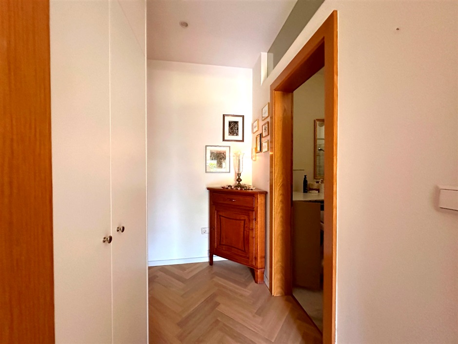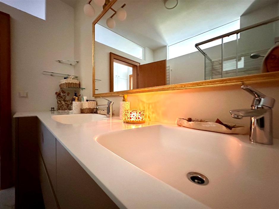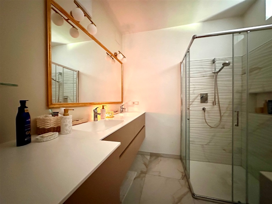 Le due camere da letto offrono tranquillità e comfort, mentre il bagno, ampio e raffinato, si distingue per i doppi lavabi e per gli inserti in vetro che permettono alla luce di filtrare in modo naturale, creando un'atmosfera piacevole e rilassante.